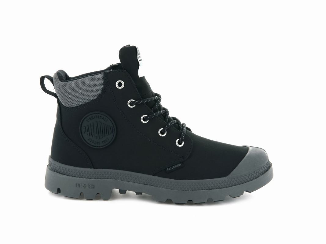 - BRANDING: Woven label folded around the tongue/Waterproof + label on heel/Palladium print on lateral quarter